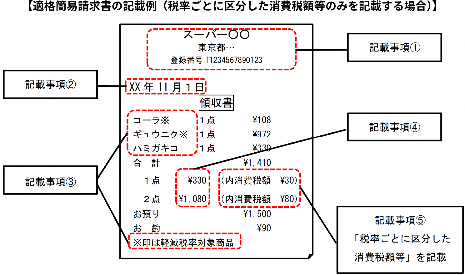 注)上記の記載事項のうち、①の登録番号を記載しないで作成したレシートは、令和元年10月1日から令和5年9月30日(適格請求書等保存方式の開始前)までの間における区分記載請求書等に該当します。